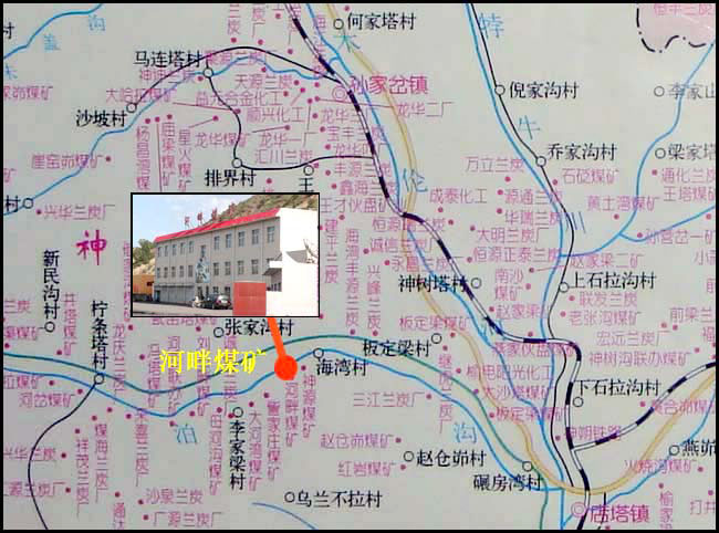 神木市孫家岔鎮海灣村河畔煤礦位於神木市孫家岔鎮海灣村,行政區劃隸屬於神木市孫家岔鎮所轄。礦井始建於1995年,原設計生產能力4萬噸/年,采煤方法為房柱式炮采。礦井範圍由8個拐點坐標組成,井田麵積為3.7298km2,該井田批準開采3-1、4-2、4-3、4-4、5-2共五層煤。