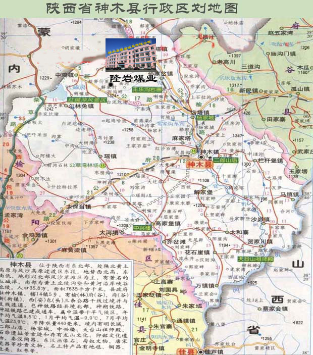 神木縣隆岩煤業有限公司煤礦(整合區) (以下簡稱“隆岩煤礦”)位於陝西省神木縣城西北約48km。礦區地理坐標在東經110°14′37″~110°15′34″,北緯39°02′12″~39°03′31″之間,行政區劃隸屬陝西省神木縣孫家岔鎮管轄。企業性質為民營合資企業。