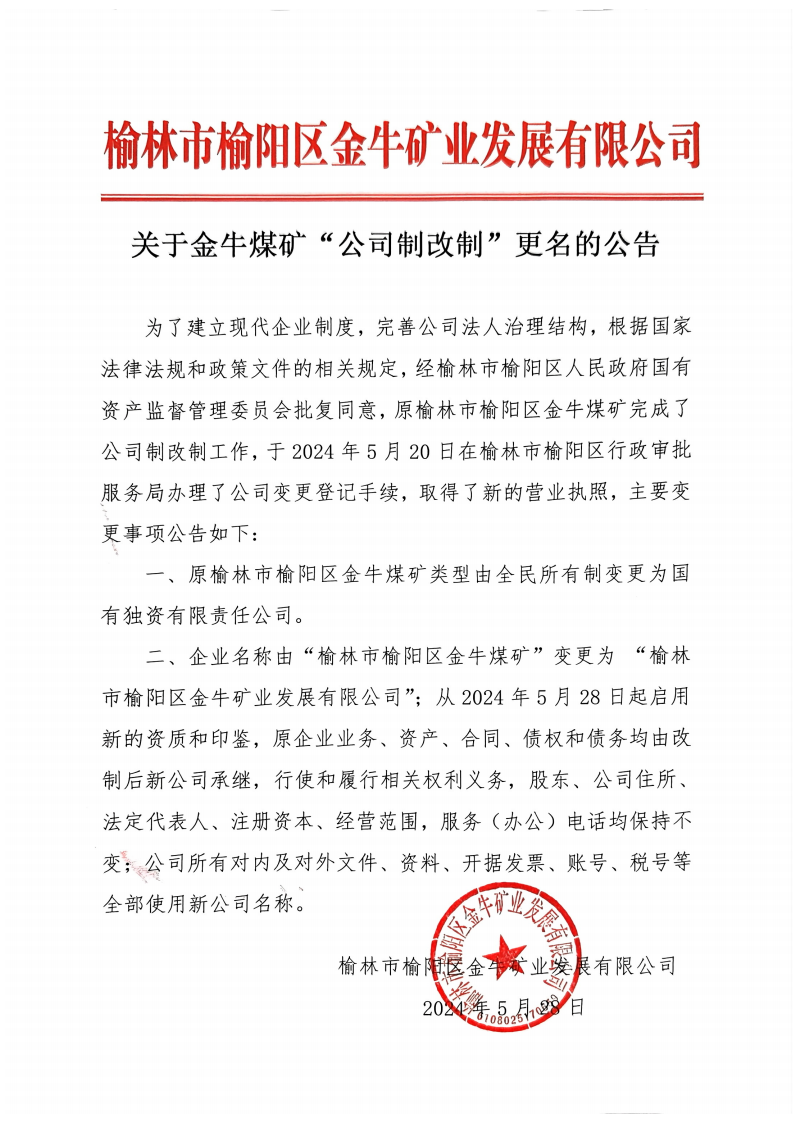 二、企業名稱由“榆林市榆陽區金牛煤礦”變更為 “榆林市榆陽區金牛礦業發展有限公司”;從2024年5月28日起啟用新的資質和印鑒,原企業業務、資產、合同、債權和債務均由改製後新公司承繼,行使和履行相關權利義務,股東、公司住所、法定代表人、注冊資本、經營範圍,服務(辦公)電話均保持不變;公司所有對內及對外文件、資料、開據發票、賬號、稅號等全部使用新公司名稱。
