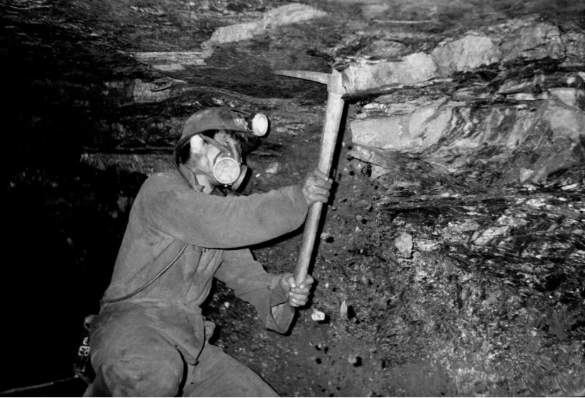 圖為用鎬拋煤的時代礦工們靠手搖鑽打眼出煤