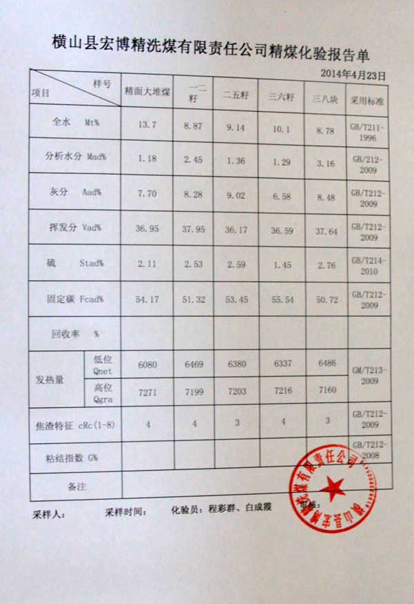橫山縣宏博精洗煤有限責任公司-化驗報告
