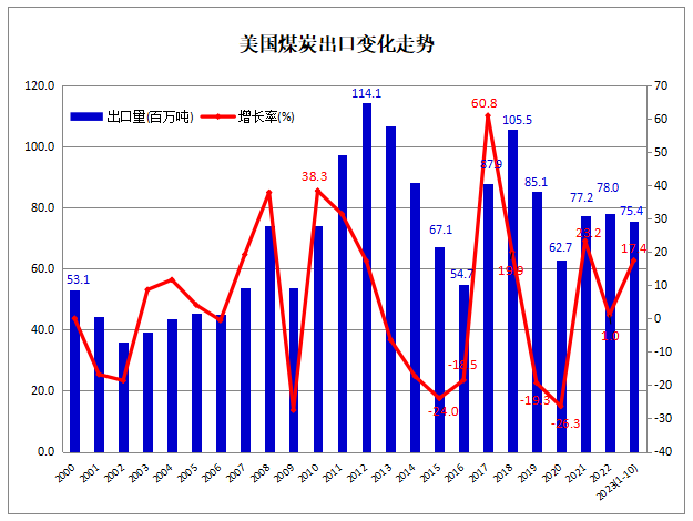 2023年1至10月美國煤炭出口同比增長百分之十七點四