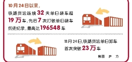yanxia,quanguoqiuliangshouhuogaofengqiganggangjieshu,nengyuanbaogongyoujinruyingfengdudongdeguanjianshiqi。weifuwuhaoguominjingjipingwenyunxingherenminqunzhongshengchanshenghuo,tielubumentongchouyunyongxianlu、車站、裝備和貨場資源,深入挖掘貨物運輸潛力,全力保障糧食、煤炭等關係國計民生的重點物資運輸。10月24日以來,鐵路貨運連續32天單日裝車超19萬車,先後7次打破單日裝車曆史紀錄,最高達196548車;11月24日,鐵路貨運單日卸車首次突破23萬車,為全國重點物資保供提供了堅強運輸保障。